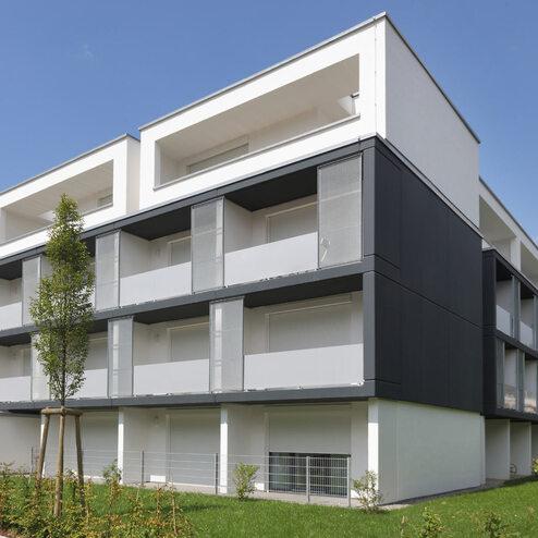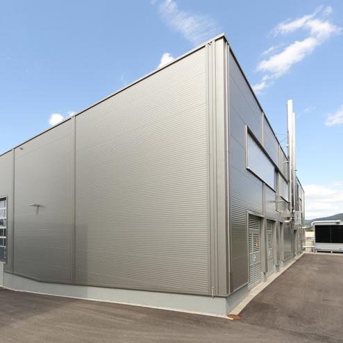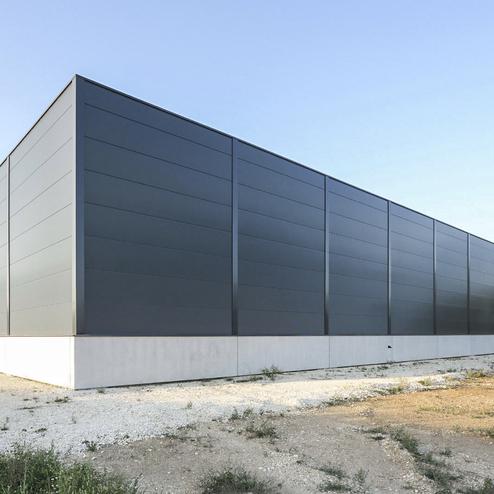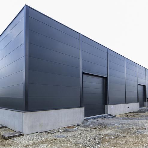 Fassade bestehend aus Polyurethan Sandwichelement außen microliniert in RAL 7016 anthrazitgrau