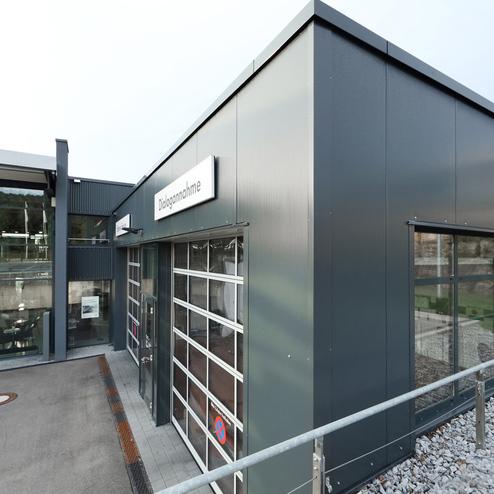 Fassade bestehend aus Polyurethan Sandwichelement microliniert in RAL 7016 dunkelgrau