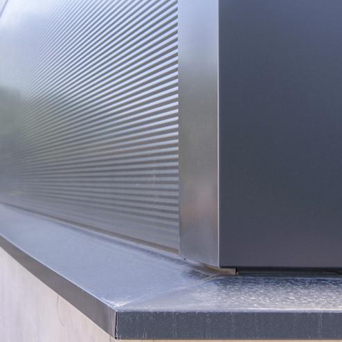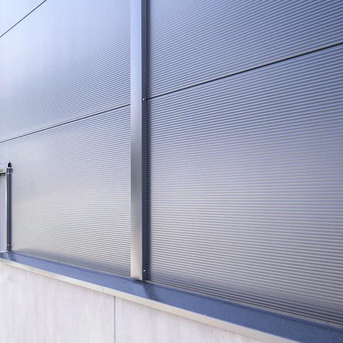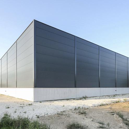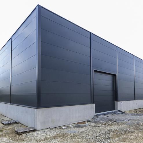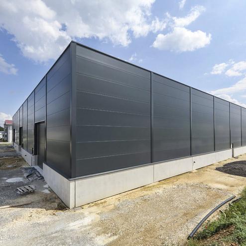 Fassade bestehend aus Polyurethan Sandwichelement außen microliniert in RAL 7016 anthrazitgrau